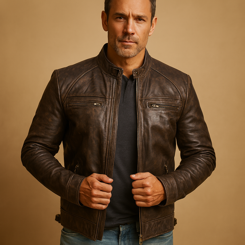Odkryj stylowy skórzana kurtka motocyklowa dla mężczyzn który łączy w sobie solidność i wygodę. Wysokiej jakości skóra zapewnia trwały i ponadczasowy wyglądpodczas gdy dopasowany krój zapewnia nowoczesny wygląd. Dzięki praktycznemu kieszenie na suwak i kołnierz z zatrzaskami ta kurtka jest zarówno funkcjonalna, jak i stylowa. Idealna dla codzienne użytkowanie, jazda motocyklem lub zwykły dzień poza domem.